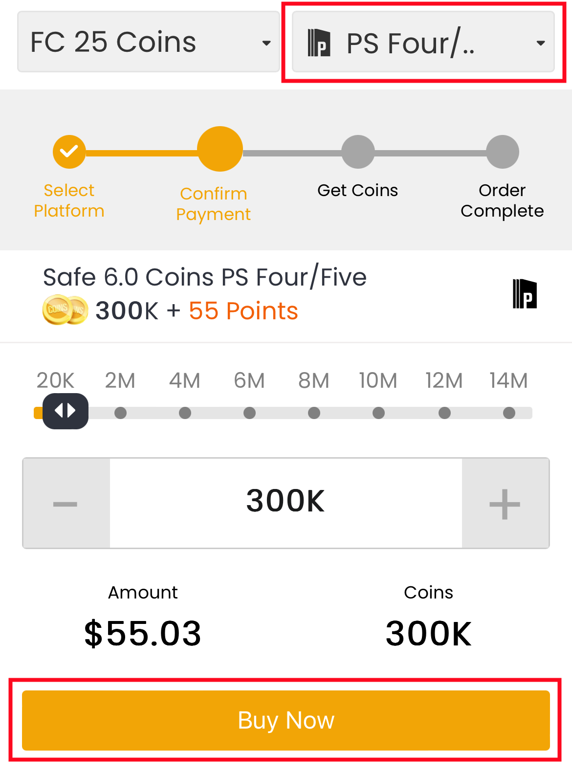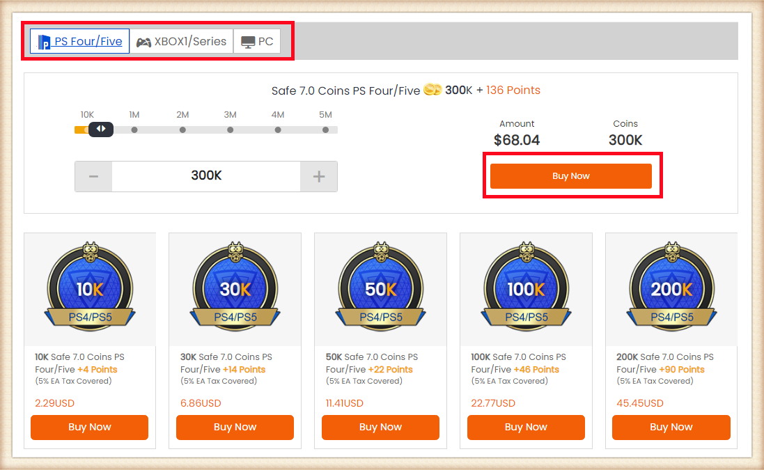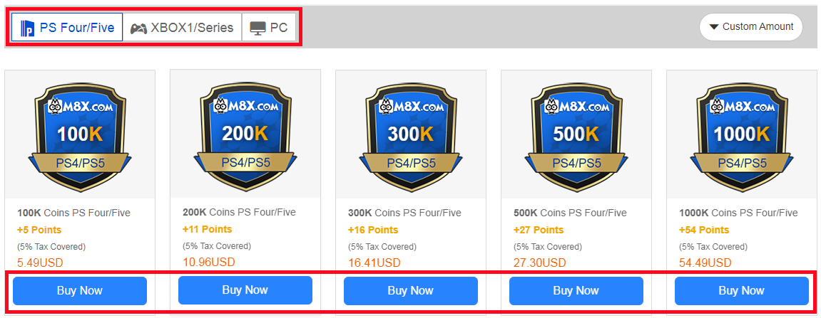 2. Select your console, then enter or select the coins amount you want to buy, and click "Buy Now".