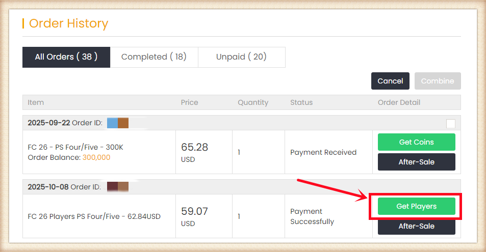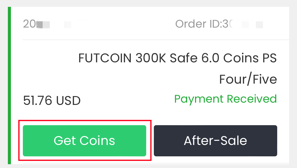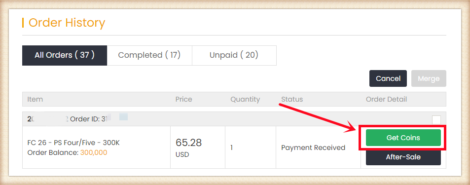 4. 转到页面底部的“获取金币”,找到您的订单,然后点击“获取金币”。