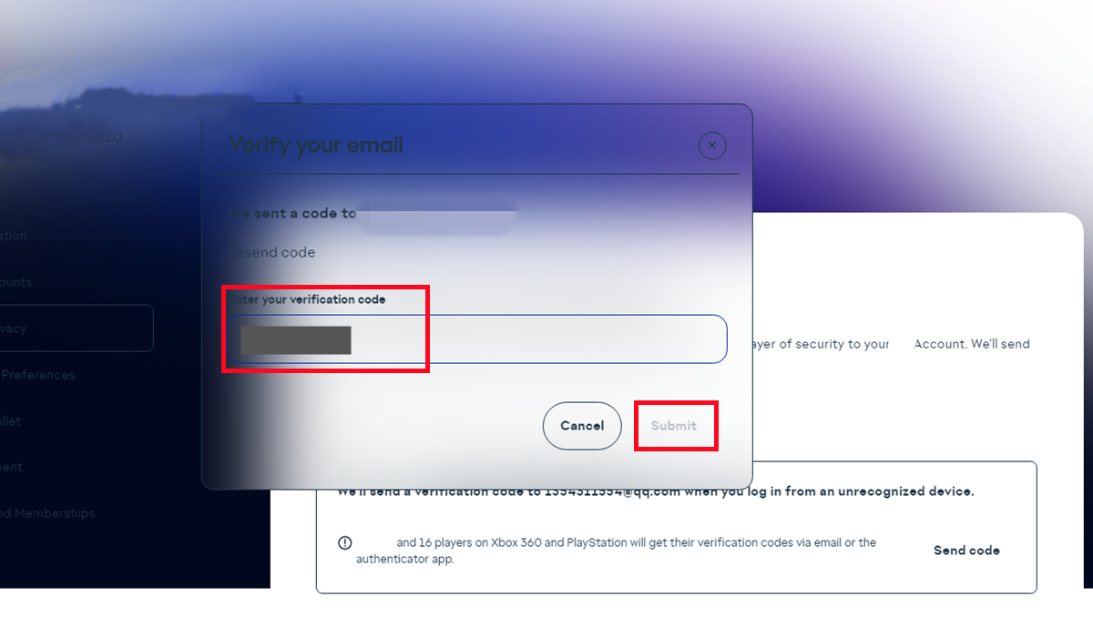 7. 输入您在电子邮件收件箱中收到的安全码,然后点击 “提交”