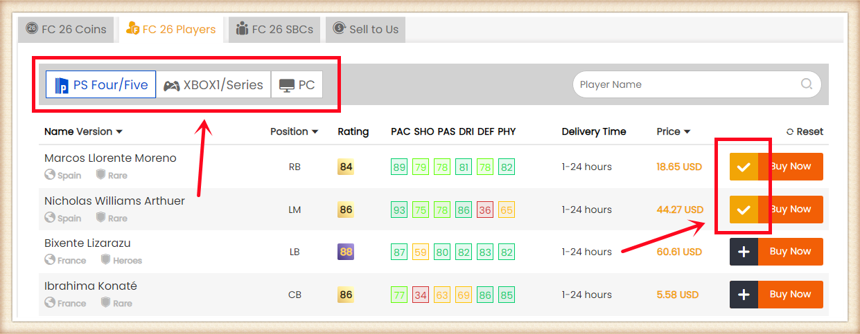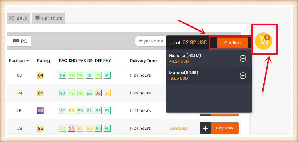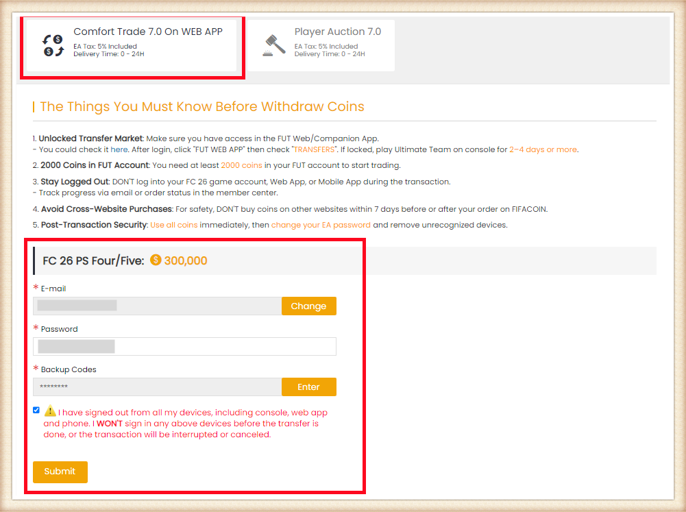 1. Please log in your FUT account and get 10000 coins at least. Having more coins will lead to faster and safer order fulfillment;