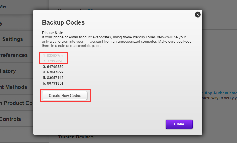 注意: 备用代码为灰色表示已使用,因为每个代码只能有效一次。