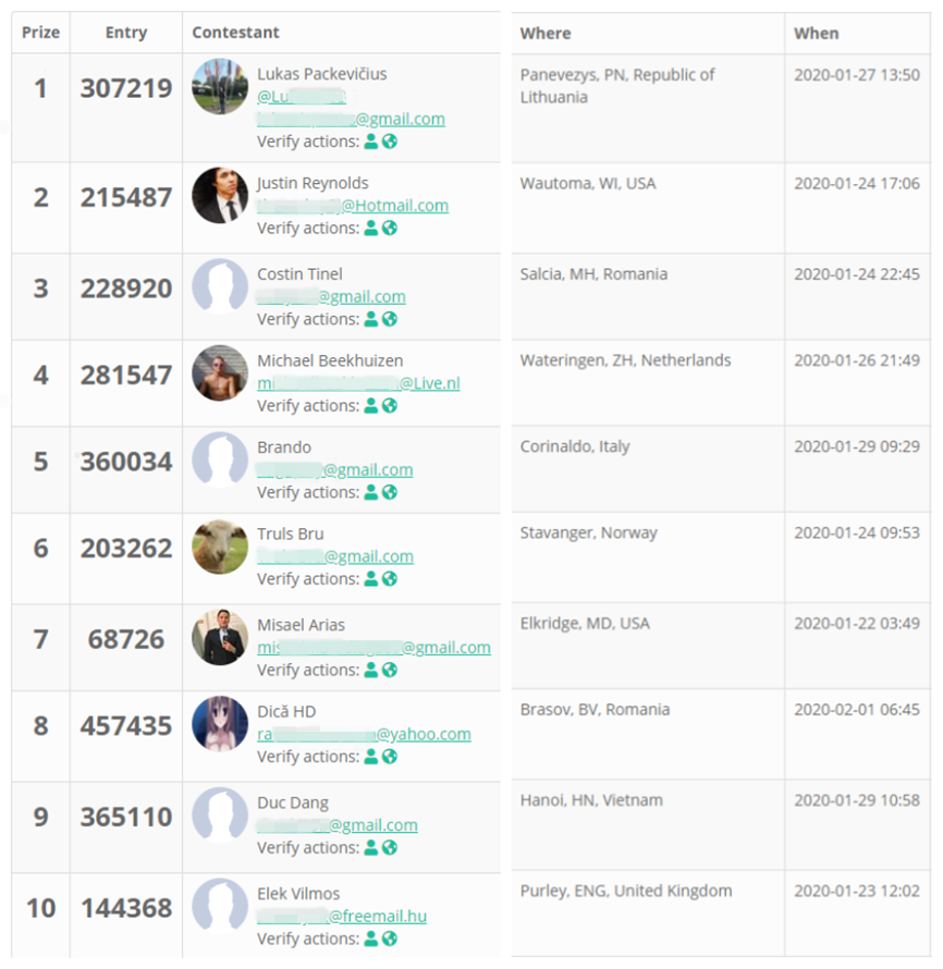 The 10 winners are randomly chosen by the third party gleam.io according to their entries as long as the event ends. The prize 2.3M coins & The list for 10 winners as follows,