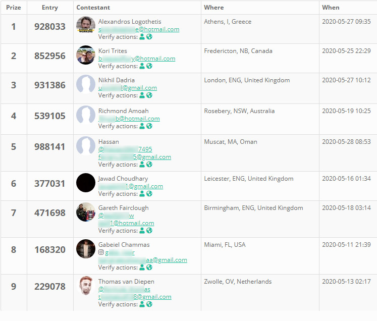 The 9 winners are randomly chosen by the third party Gleam according to their entries as long as the event end, and we will check if the participation of the winners is effective, such as whether or not you really follow FIFACOIN socials. Now let’s check the prizes and winners!